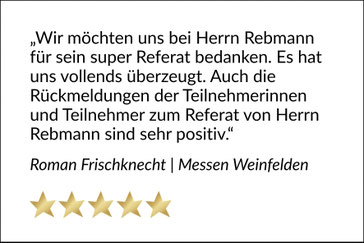 Ein erfolgreicher Keynote Speaker punktet nicht nur auf der Bühne, sondern auch durch seine Außendarstellung. Referenzen von renommierten Kunden, begeisterte Stimmen von Teilnehmern und starke Bewertungen sprechen für sich. Auch die eigene Webseite sollte professionell gestaltet sein und Lust auf mehr machen. Hochwertige Fotos, prägnante Inhalte und präsente Social-Media-Aktivitäten zeigen: Hier handelt es sich um einen Experten, der etwas zu sagen hat. Ein Tipp: Vertrauen Sie auf Bewertungen und Empfehlungen, aber hören Sie auch auf Ihr Bauchgefühl.